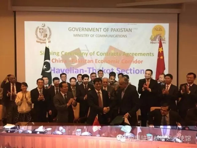2015年12月22日,两家中国企业在巴基斯坦分别与巴国家高速公路管理局成功签署两个重大交通基础设施建设项目合同:中国建筑股份有限公司签署卡拉奇-拉合尔高速公路(苏库尔-木尔坦段)项目EPC总承包合同,合同金额约28.9亿美元;中国交建签署喀喇昆仑二期(赫韦利扬-塔科特段)公路项目EPC总承包合同,合同金额约合13.15亿美元。