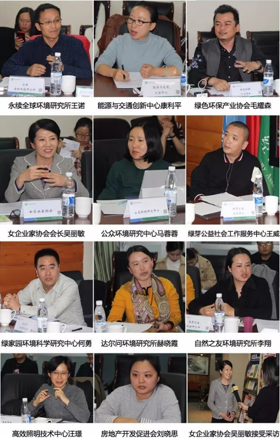 北京市绿色环保产业协会会长毛耀森、女企业家协会会长吴丽敏、永续全球环境研究所(GEI)王诺、能源与交通创新中心康利平、公众环境研究中心马蓉蓉、绿芽公益社会工作服务中心王威、绿家园环境科学研究中心何勇、达尔问环境研究所赫晓霞、自然之友环境研究所李翔、高效照明技术中心汪璟、房地产开发促进会刘晓思等代表分别从《助力绿色制造与环保服务》、《绿化经济社会产业结构》、《生态社区建设》、《绿色出行大数据科技研究与应用》、《绿色供应链与绿色金融》、《城市低值固废资源化社区试点》、《绿色发展与公众参与研究》、《绿色生活与环境教育》、《高效照明公众技术研究》、《建筑绿色化》等维度,分析研讨十九大报告对绿色发展各项工作产生的积极影响与指导作用,引申和分析了社会组织围绕绿色发展开展互助共建的具体思路与方案。